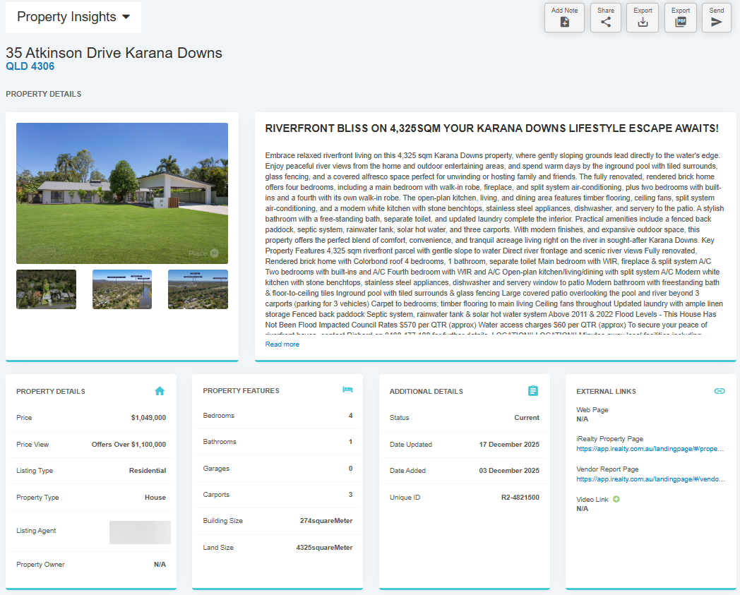 This property view also includes the description of the property and its title, which feeds directly from your CRM. It will also show when the property was added to iRealty and when it was last updated and which id it connects to from your CRM.