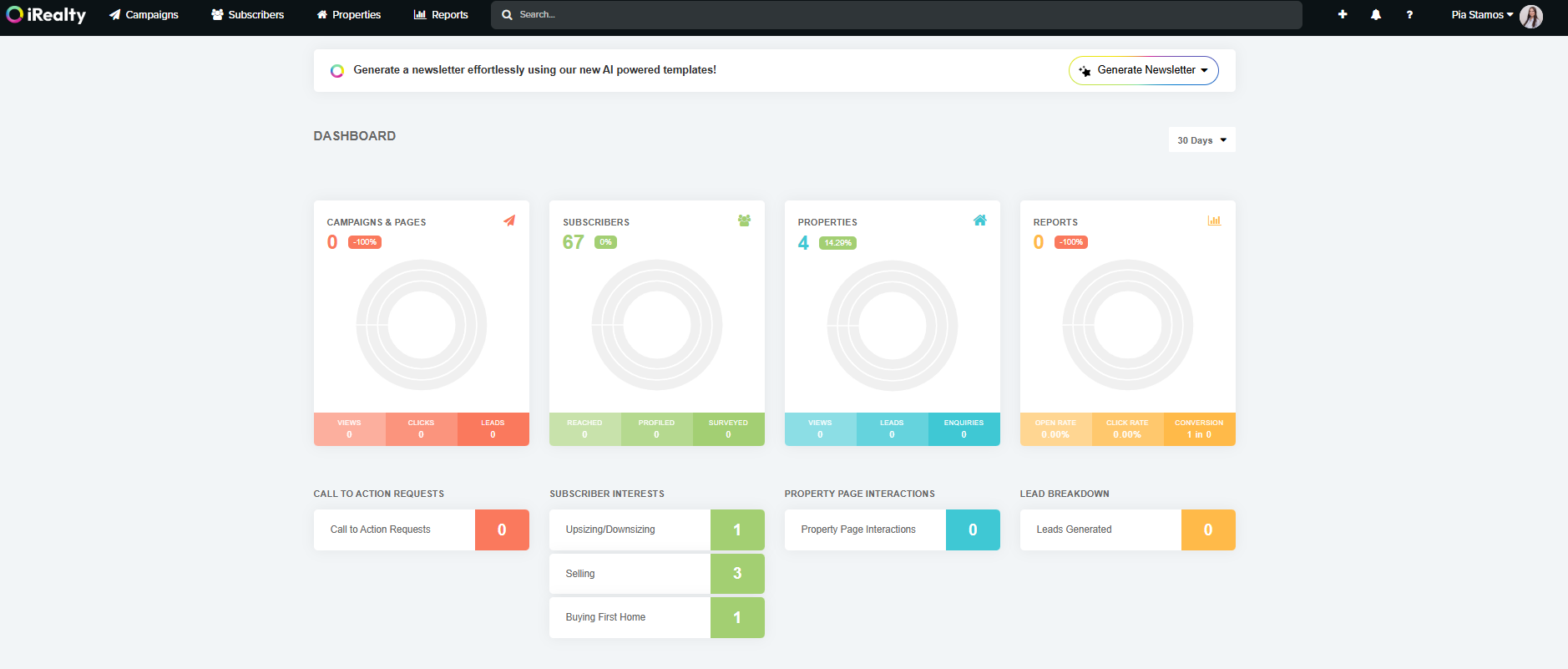 This feature allows you to search and access subscribers, email campaigns, properties and reports efficiently from one central location. The Search bar is helpful for quickly finding the information you need.