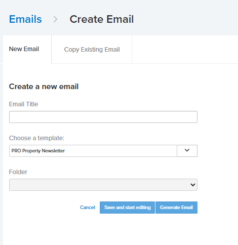 - Create Email - This option directs you to the Create a New Email page, where you can select a template to work from and choose whether to edit the email manually or generate content automatically.