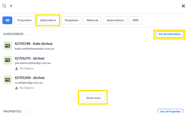 The search bar allows you to quickly locate subscribers, templates, properties, automations, emails and SMS, providing an efficient way to find the information you need.